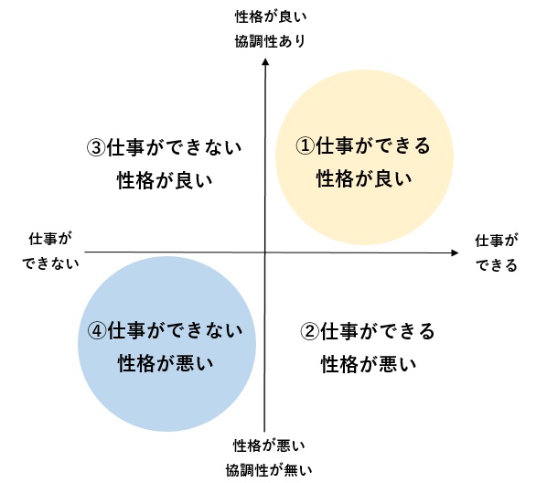 会社の中の人を仕事軸と人間性軸に分けると4象限に分けることができます。